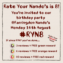 Our eighth birthday is upon us and we can't wait to celebrate with you at Farringdon Nando's at 19:30 on Monday 14 August.